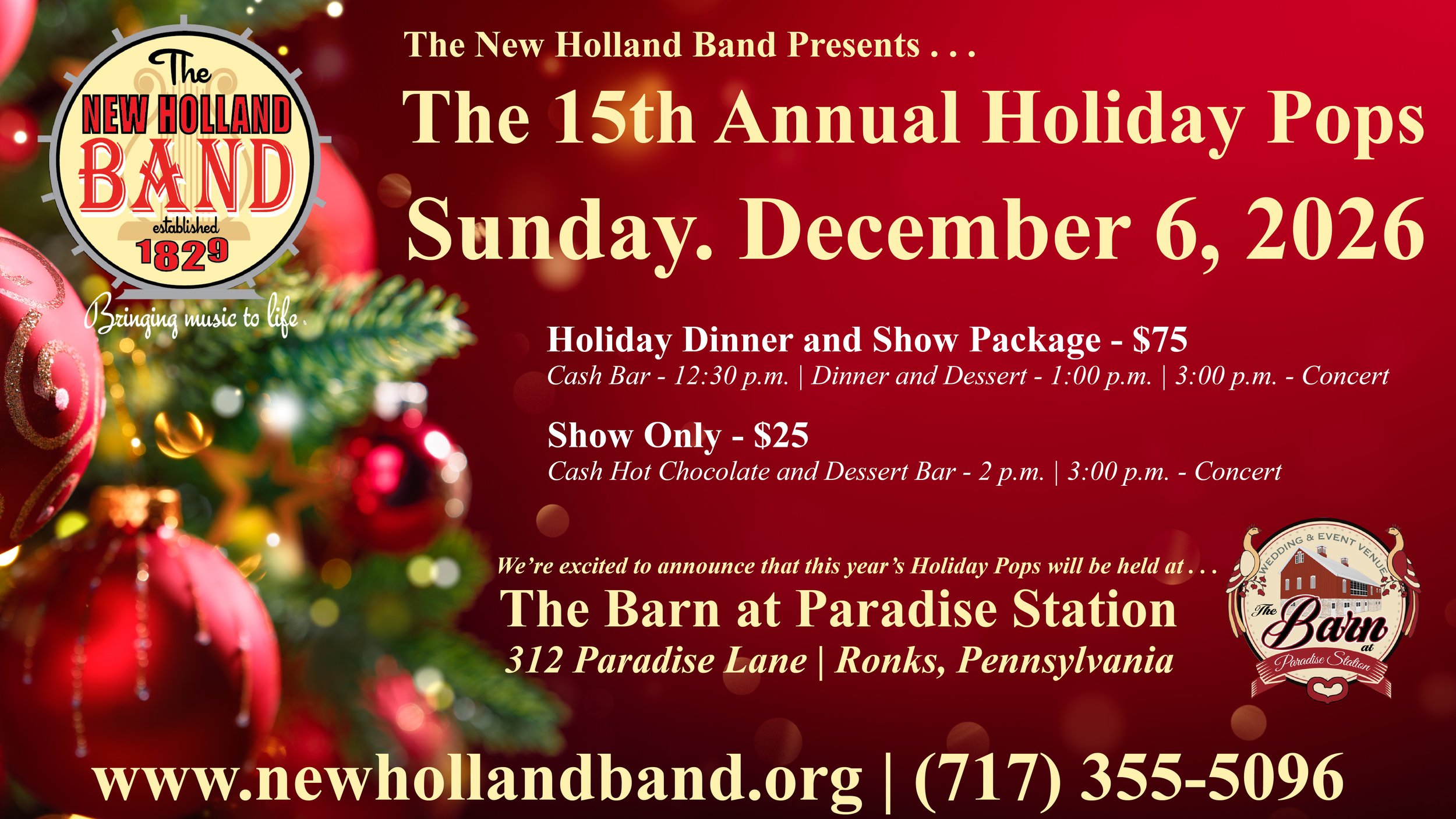 Back to All Events The New Holland Band - 15th ANnual Holiday Pops Concert Sunday, December 6, 2026 3:00 PM 4:30 PM The Barn at Paradise Station 312 Paradise Lane Ronks, PA, 17572 United States (map) Google Calendar ICS Purchase Tickets Presented by The New Holland Band, join us for the 15th Annual Holiday Pops Concert! Ticketing is directly through The New Holland Band, so please click on the ticketing link or call 717-355-5096 for assistance, information, and more.
